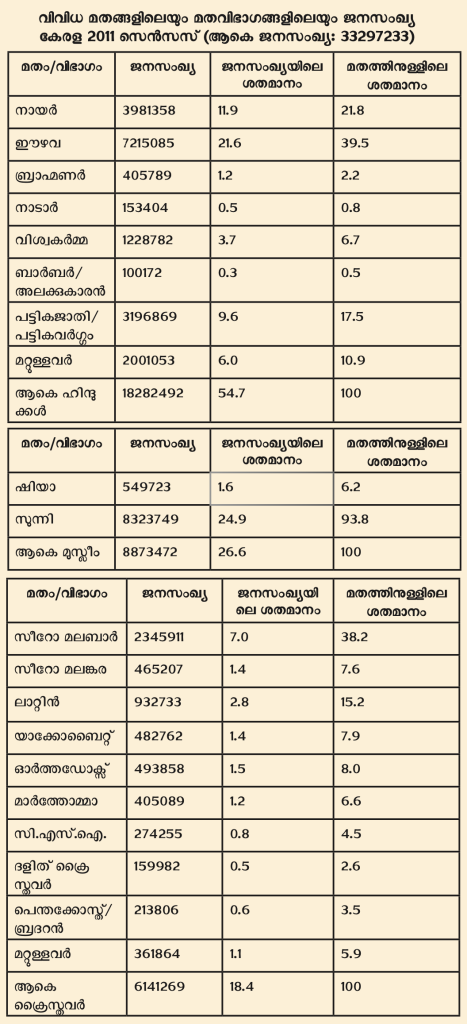 2011 ലെ സെൻസസ് പ്രകാരം, കേരളത്തിലെ ഏറ്റവും വലിയ ജനസമൂഹം സുന്നി മുസ്ലീം ആണ് (24.9%). തൊട്ടടുത്തു തന്നെ 21.6% ആയി ഈഴവര്. ഈഴവര്ക്ക് പിന്നില് 11.9% ആയി നായന്മാരും 7% ആയി സീറോമലബാര് ക്രൈസ്തവരും. കേരളത്തിലെ 14 ജില്ലകളില് 12 ജില്ലകളും ഹൈന്ദവ ഭൂരിപക്ഷ ജില്ലകളാണ്. കേരളത്തിലെ മത സൗഹാര്ദ്ദത്തിന്റെ കാരണവും മറ്റൊന്നല്ല.