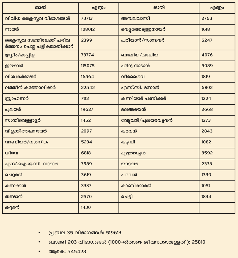 സര്ക്കാര് മേഖലയിലെ ജാതി അടിസ്ഥാനത്തിലുള്ള കണക്കുകളിലേക്ക് പോകുന്നതിന് മുമ്പ് കേരളത്തിലെ ജാതി/ഉപജാതി അടിസ്ഥാനത്തില് ലഭ്യമായ കണക്കുകളും സര്ക്കാര് മേഖലയിലെ തൊഴിലവസരങ്ങളുടെ കണക്കുകളും കൃത്യമായി മനസ്സിലാക്കേണ്ടതുണ്ട്. പ്രത്യേകിച്ചും ന്യൂനപക്ഷ വിഭാഗങ്ങളുടെയും ഭൂരിപക്ഷ സമുദായങ്ങളുടെയും ജോലി ലഭ്യതയെക്കുറിച്ചുള്ള സത്യസന്ധമായ കണക്കുകള് മതേതര കേരളത്തിലെ പൊതു ജനസമൂഹവും ന്യൂനപക്ഷ ഭൂരിപക്ഷ സമുദായ നേതാക്കളും അവരെ പിന്തുണക്കുന്ന രാഷ്ട്രീയ നേതാക്കളും കൃത്യമായി അറിഞ്ഞിരിക്കേണ്ടതാണ്.
