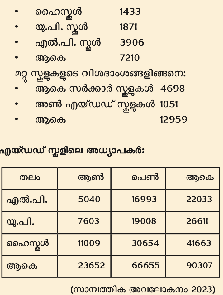 കേരളത്തിലെ 7210 എയ്ഡഡ് സ്കൂളുകളിലെ 90307 അധ്യാപകരില് 40% എങ്കിലും ക്രൈസ്തവ മാനേജ്മെന്റിന് കീഴിലുള്ളതാണ്. ബാക്കി എന്.എസ്.എസ്., എസ്.എന്.ഡി.പി., എം.ഇ.എസ്. എന്നീ വിദ്യാഭ്യാസ ഏജന്സികളുടെ കീഴിലുള്ളവയാണ്. നായന്മാരുടെയും ഈഴവരുടെയും മുസ്ലീമുകളുടെയും സര്ക്കാര് ജീവനക്കാരുടെ എണ്ണത്തിലും ഇത് ഒരു നിര്ണ്ണായക ഘടകം ആണെന്ന കാര്യം വിസ്മരിക്കാനാവില്ല.